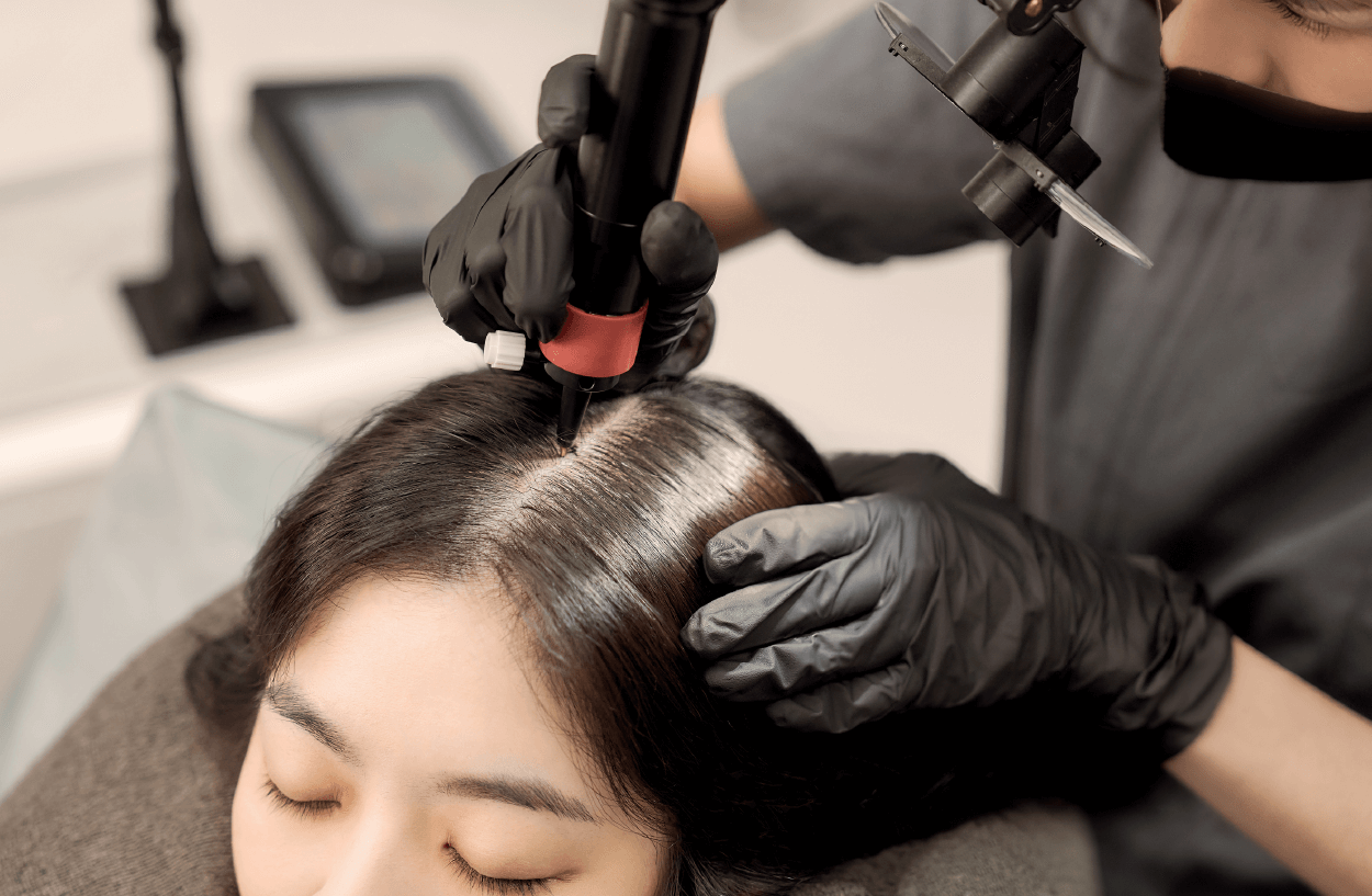 蕬域方舟採用國際知名紋綉儀器GriMii,以特殊水脈衝科技將醫療級顏料轉印於頭皮,達成視覺上豐盈髮量的效果。